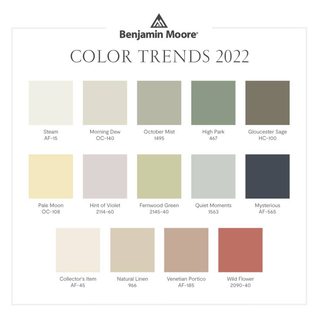 This choice reinforces that green is having its moment. October Mist was chosen as the color of the year from the color trends palette for 2022. This palette includes a range of 14 colors varying from whimsical, meditative and eclectic. But, one overarching theme of the color palettes is the strong prominence of green.