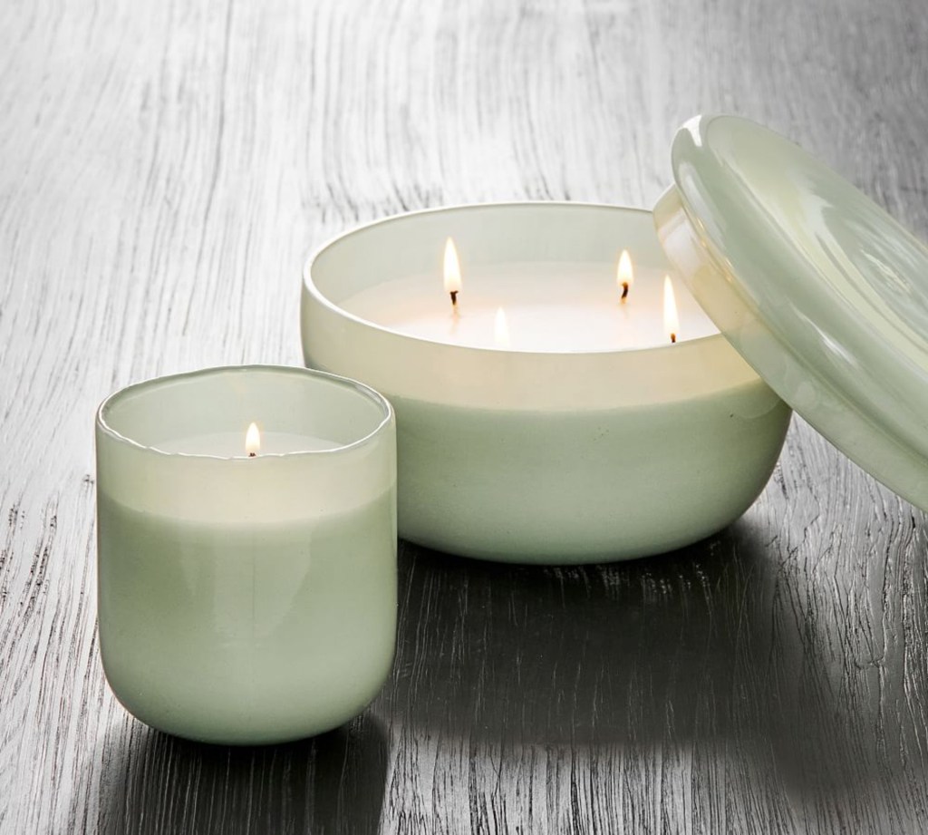 Pottery Barn ‘Modern Glass Candle – Moroccan Mint’ is a functional way to reinforce an accent color throughout your space.